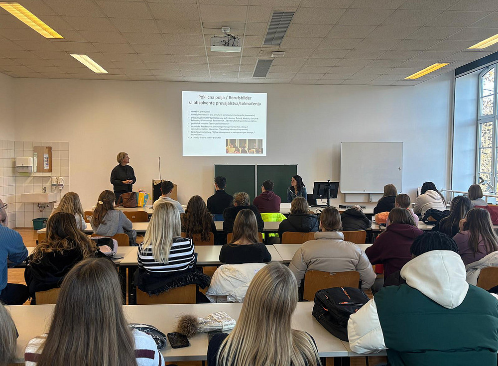 Am 28. November 2025 besuchten fünfundvierzig 14- bis 18-jährige Schülerinnen und Schüler des slowenischen Gymnasiums aus Slovenske Konjice das ITAT und die Slawistik. Sie erhielten Einblicke in das Studium der Übersetzungswissenschaft und Slowenistik und sahen unser Promotionsvideo. Anschließend sind wir gemeinsam durch unseren Flur gegangen und haben die Räume der Slawistik besichtigt. Danach gingen wir ins Übersetzungslabor des ITAT, wo wir die Studentinnen bei den Dolmetschen-Übungen mit Rosemarie Linde (Deutsch-Slowenisch) beobachten konnten und mit den Studentinnen sprechen.
