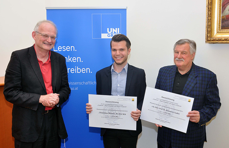 Bereits zum dritten Mal wurde an der Geisteswissenschaftlichen Fakultät die Auszeichnung für eine qualitätsgesicherte Veröffentlichung auf Basis der Masterarbeit vergeben. Am 7. Mai überreichte der GEWI-Dekan Lukas Meyer dem Linguisten Dimitrios Meletis, BA BA MA und seinem Betreuer Ao. Univ.-Prof. Dr. Hanspeter Gadler vom Institut für Sprachwissenschaft im Rahmen eines Festaktes den Preis.